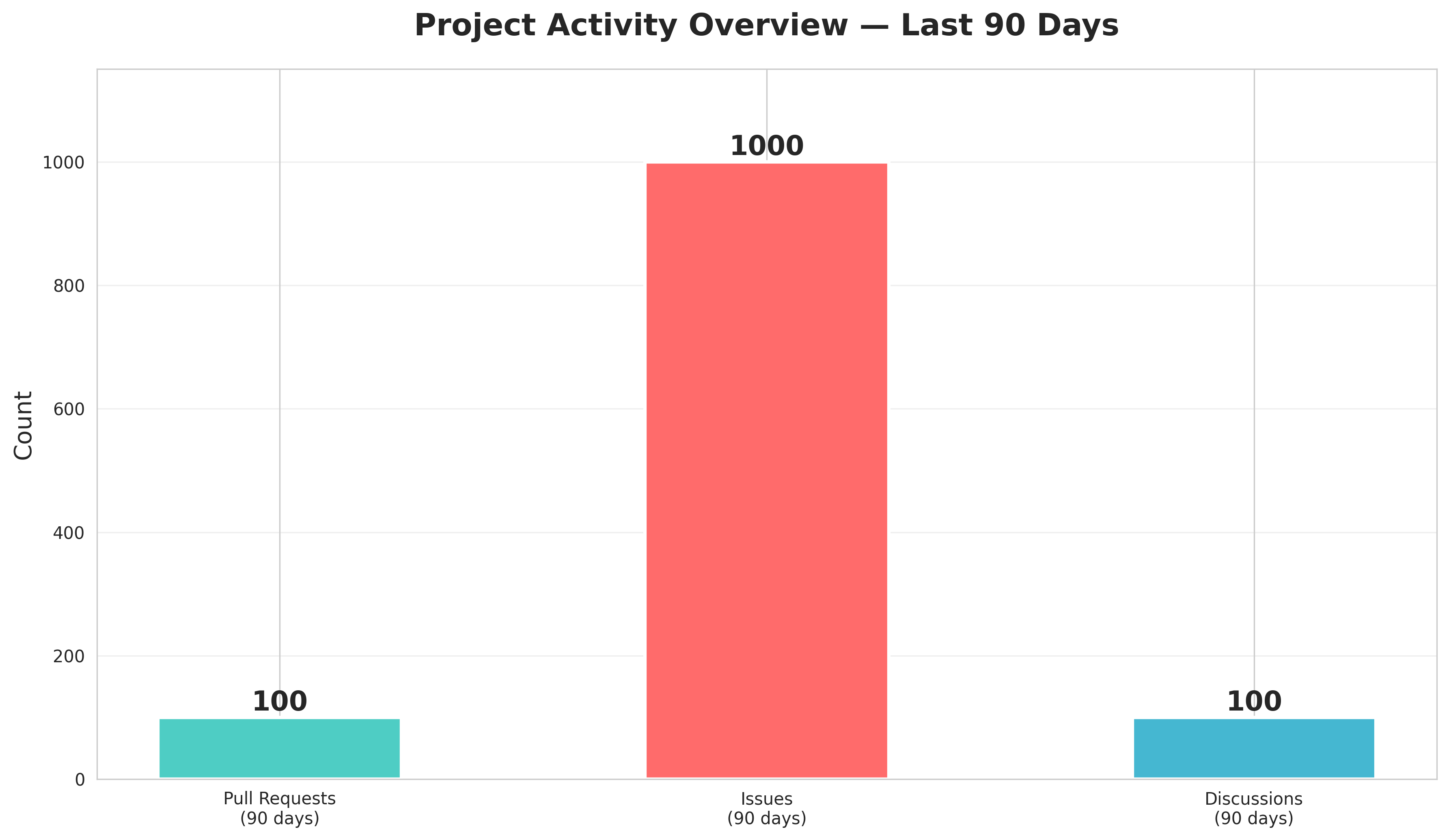 The project shows high issue activity (1,000 in 90 days), reflecting active bug reporting and feature tracking. PR volume (100) and discussion activity (100) demonstrate healthy community engagement and focused development work.
