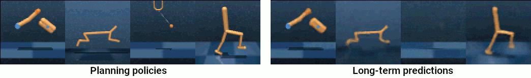 PlaNet models the world as a compact sequence of hidden states. For planning, we first encode the history of past images into the current state. From there, we efficiently predict future rewards for multiple action sequences in latent space. We execute the first action of the best sequence found and replan after observing the next image.