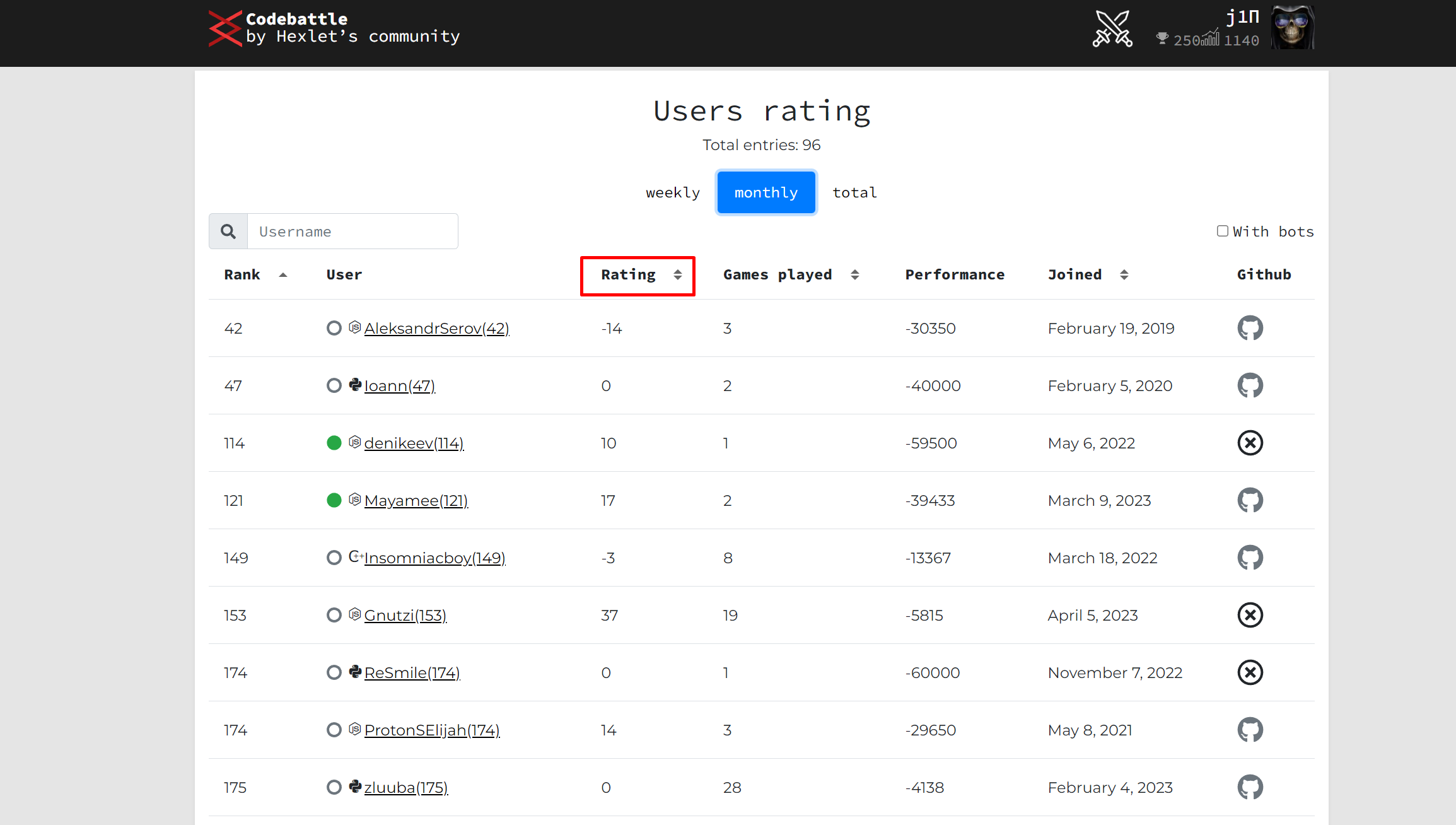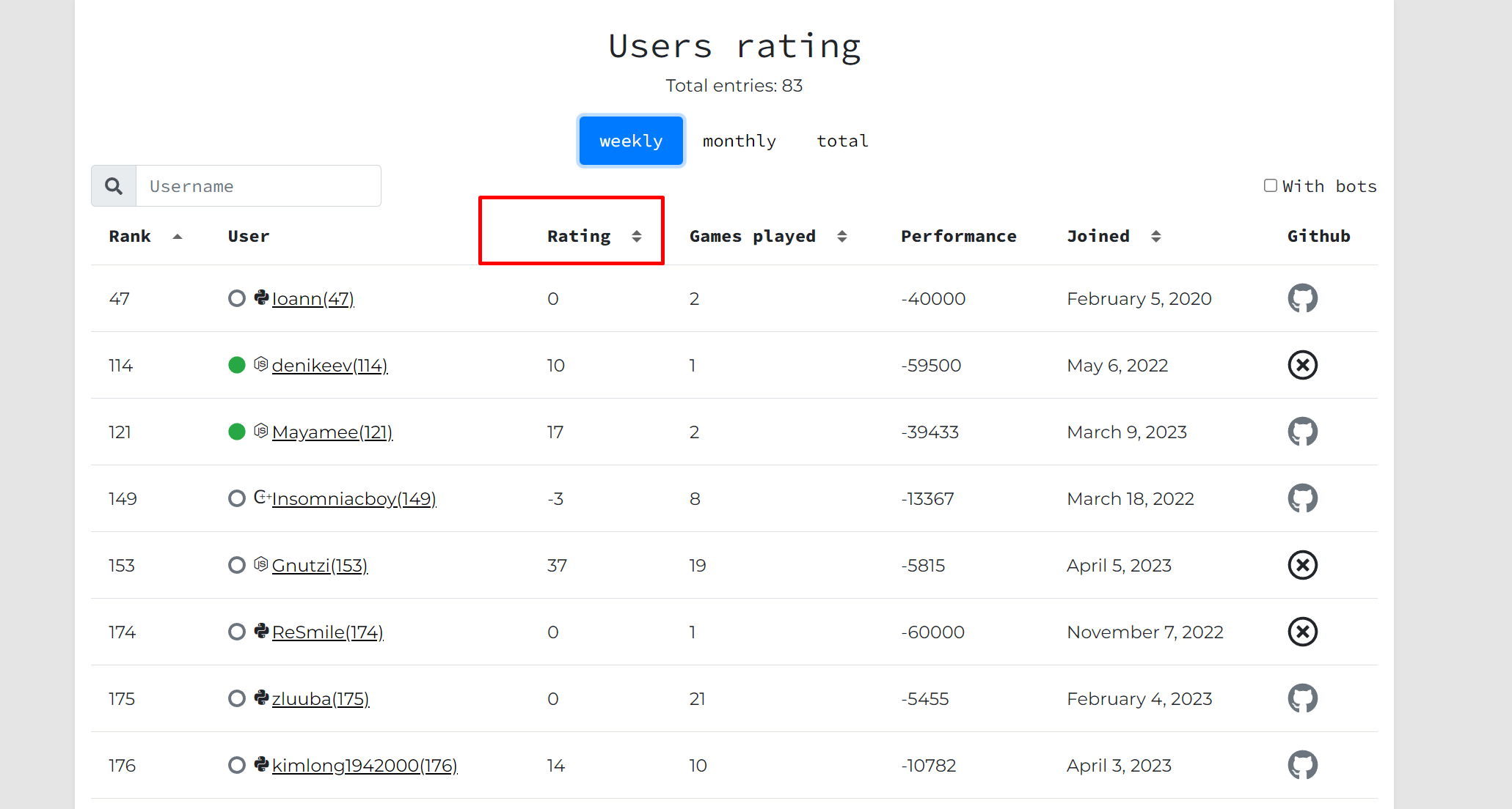 Фильтр по "Rating" должен быть default при переключении вкладок "weekly"/"monthly"/"total"