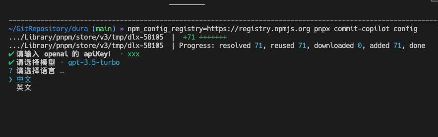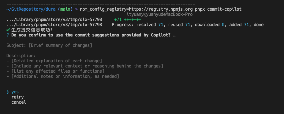 npm_config_registry=https://registry.npmjs.org pnpx commit-copilot以下是 Commit Copilot 的使用示例: