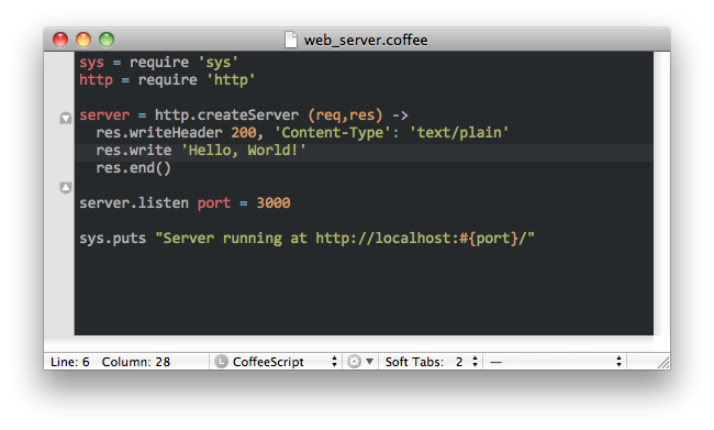 The bundle includes syntax highlighting, the ability to compile or evaluate CoffeeScript inline, convenient symbol listing for functions, and a number of expando snippets.