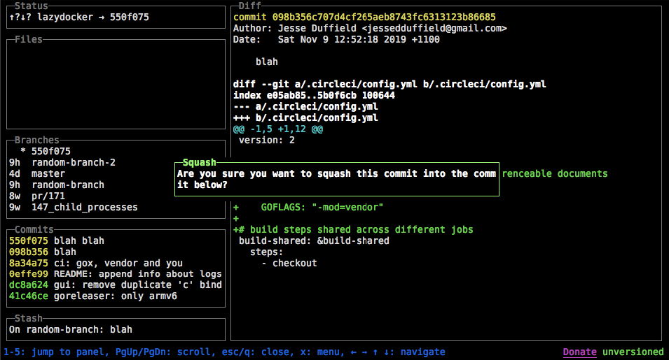 Behind the scenes this begins an interactive rebase, creates the todo file, sets the command to 'squash', and continues. The same short-hand approach is supported for dropping, squashing, fixing up, and rewording commits, using the 'd', 's', 'f', and 'r' keybindings respectively. You can even shift a commit up one with ctrl+K and down one with ctrl+J