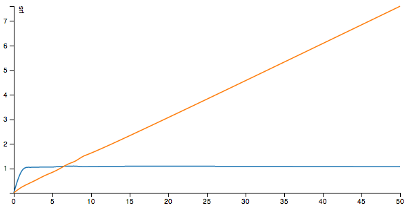 As you can see, the set-selector is mostly constant time as the number of selectors in the set grows O(1). But matching every selector every time is linear as to the number selectors O(N). There is a slight overhead to using selector-set when there are only a few selectors (<5). This is something that can be improved, but it maybe pointless to use the set if you only want to match one or two selectors.