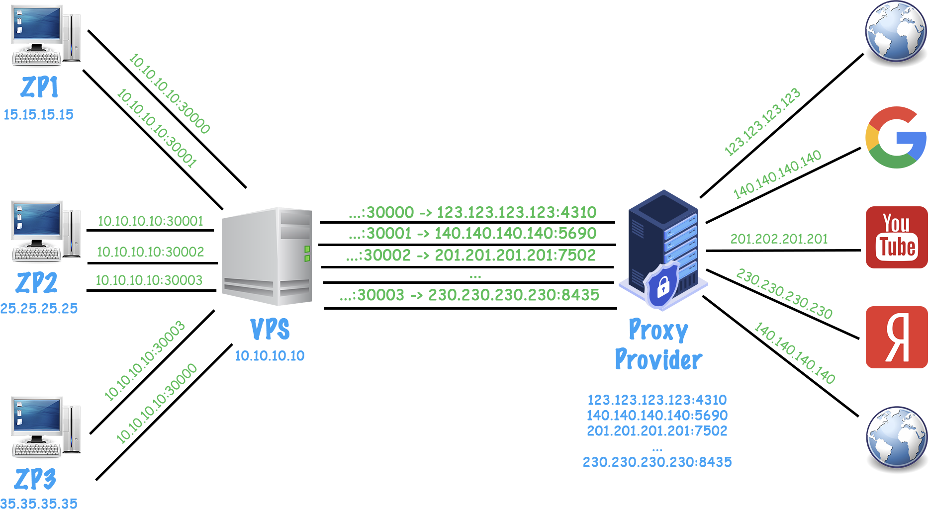 Данный скрипт предназначен для поднятия туннеля с socks5 прокси для коннекта через него со множества машин в одного жирного прокси-провайдера c socks5.