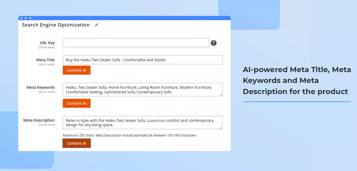 MageComp's Magento 2 ChatGPT AI Content Generator module generates compelling & creative page titles, Meta descriptions & a bunch of related keywords for your Magento 2 store.