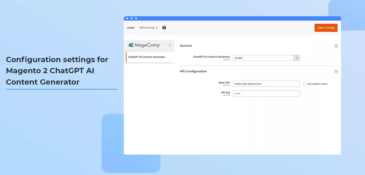 API Key of OpenAI is used for generating high-quality content. Configure the API by setting Base URL & API key and start leveraging the module.