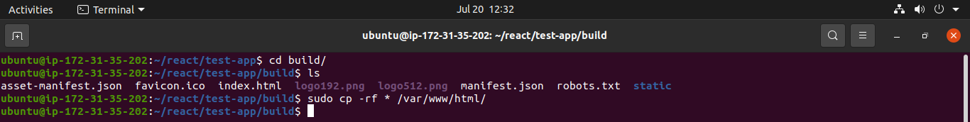 Now, to deploy for production environment enter to directory with APP_NAME then run sudo npm run build it will create a build folder.