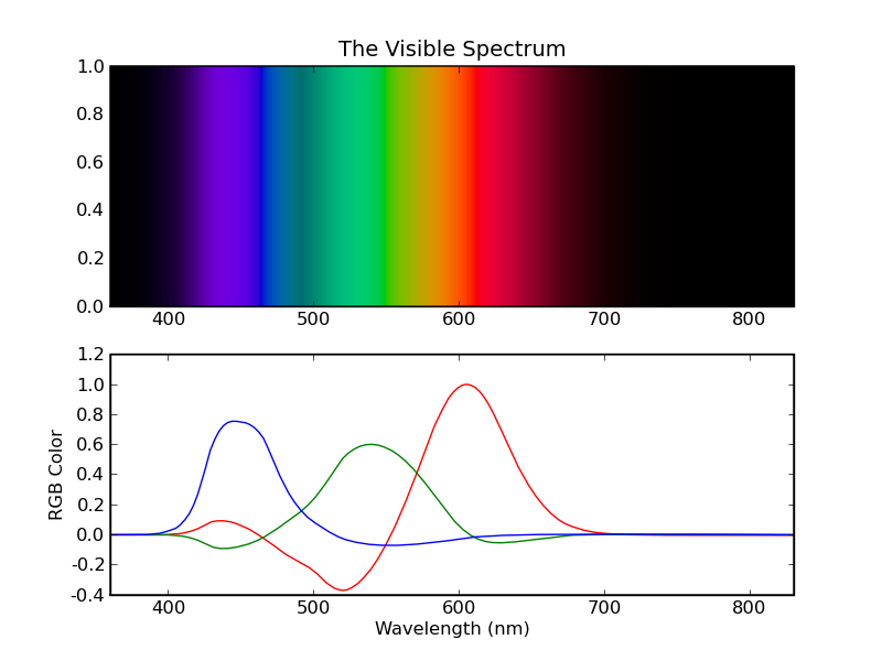 A taste of the plots that ColorPy can create: RGB values for the pure spectral lines.