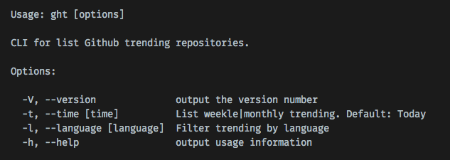 GitHub Trending CLI CLI for list Github trending repositories. Installation npm install -g github-trending-cli How to use