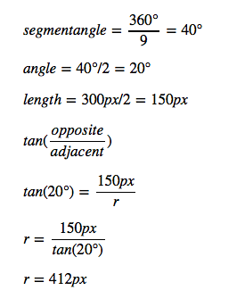 }Math.round( ( 300 / 2 ) / Math.tan( Math.PI / 9 ) ) = 412;