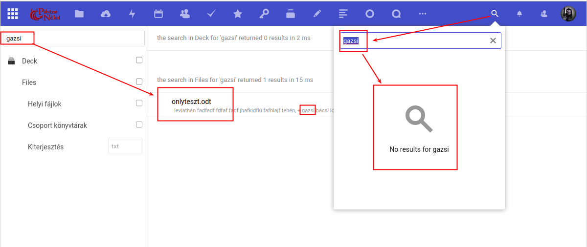 Here is the Nextcloud log in case of searching via the search application, which actually can provide the expected result: