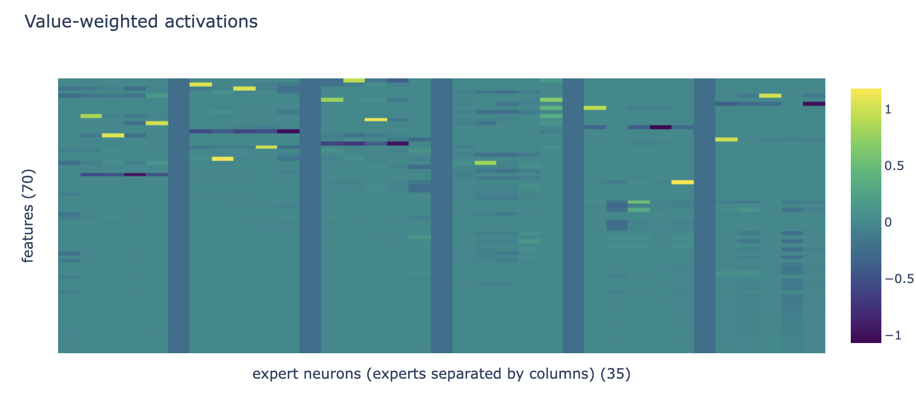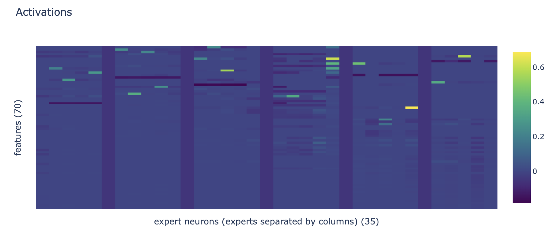 Below is the result from using the SoLU MoE layer as an autoencoder for a sparse feature toy model fairly similar to https://transformer-circuits.pub/2022/toy_model/index.html: