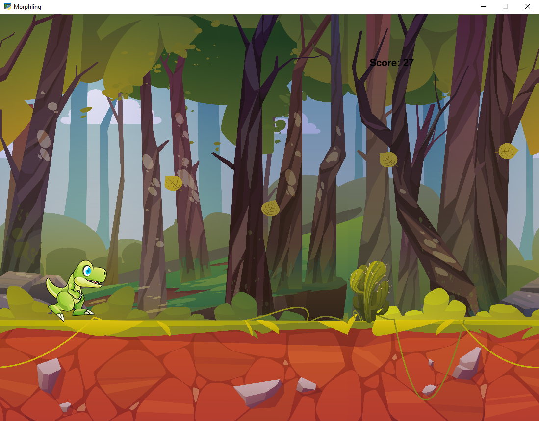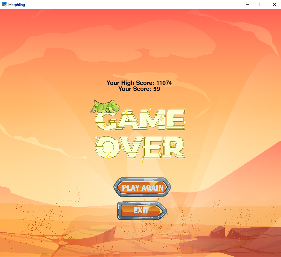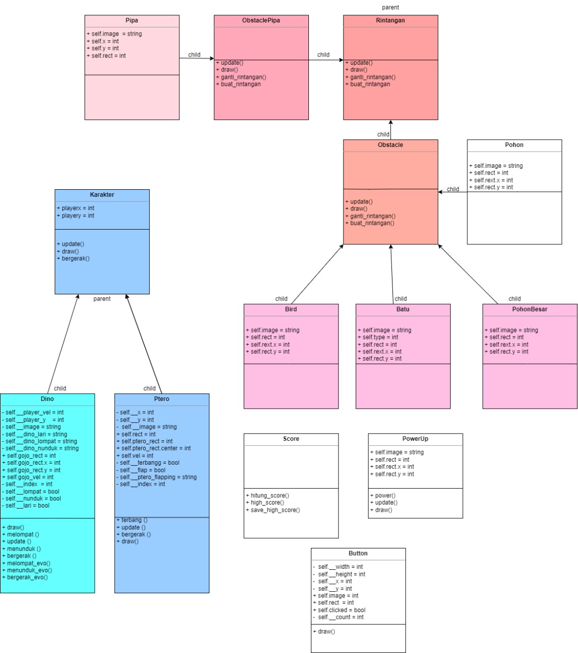 ## Deskripsi ProjekAplikasi ini merupakan permainan yang dibuat menggunakan library Pygame tentang dua ekor dinosaurus bernama Gojo (Dinosaurus Hijau) dan Pterodactyl (Burung Dinosaurus). Tujuan dari permainan ini adalah mendapatkan score sebanyak-banyaknya dengan cara menghindari rintangan. Untuk memulai permainan, user dapat memilih salah satu karakter di atas dan setiap karakter mempunyai stage dan rintangan yang berbeda. Pada pemilihan karakter Gojo (Dinosaurus Hijau), karakter tersebut harus menghindari rintangan berupa Batu, Love Bird, dan Pohon yang ditampilkan secara random dengan cara melompat dan menunduk agar tidak mati dengan cepat (Game Over). Kemudian, seiring berjalannya score, karakter Gojo ini akan berevolusi menjadi lebih besar dari ukuran semula dan ketika menyentuh score tertentu karakter Gojo akan kembali ke bentuk awal. Permainan akan berakhir apabila karakter menabrak rintangan. Selanjutnya, pada pemilihan karakter Pterodactyl (Burung Dinosaurus), karakter tersebut harus menghindari rintangan berupa Pipa yang terbentuk secara vertikal pada bagian atas dan bawah. Karakter tersebut harus melewati celah di antara kedua pipa yang terbentuk dengan melakukan gerak terbang. Permainan akan berakhir apabila karakter menabrak rintangan (Game Over).