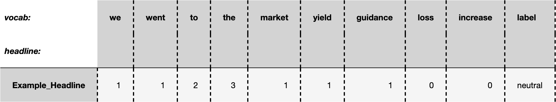 The first approach is a BOW (Bag Of Words) model. BOW model is simply taking the entire vocabulary of all of our headlines and using each word in our voaculary as a feature. Then, the features for any given headline is the word count for every word in the vocabulary. For example, consider the headline: