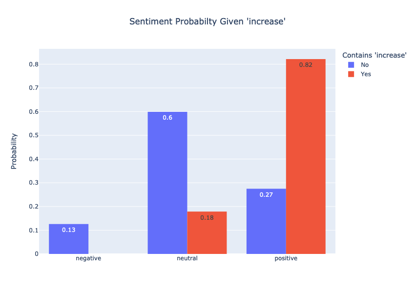 The calculation above confirms what we see in the plot. You can view the code in the EDA notebook to see the calculations. The following two plots illustrate the same conditional probabilities with different key words.