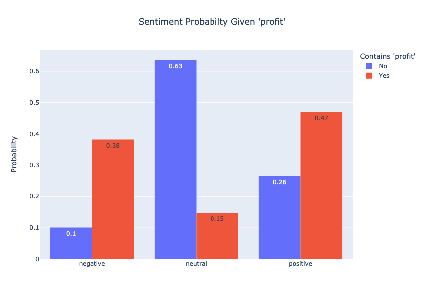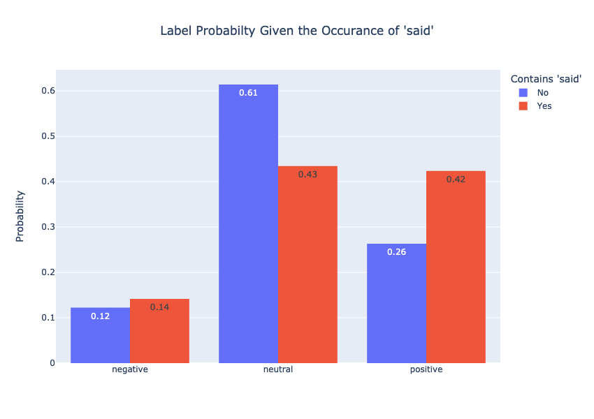 I did not include every column, but you can see how our model will use the information from the headline to make a prediction. Using word counts can give us some useful plots for understanding which words contribute to news sentiment. The plot below shows the probability of each sentiment given that the word said appears in our headline.