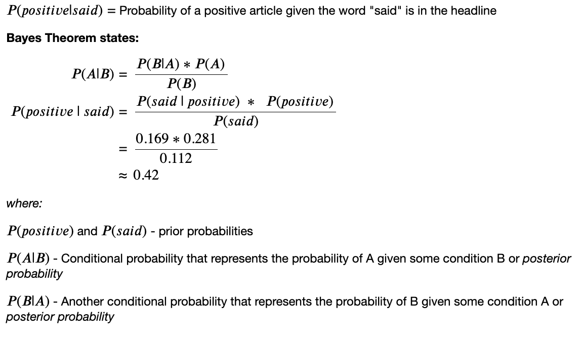 In red are the probabilities given that said appeared in the headline, and in blue are the headlines where said does not appear in the headline. We can calculate the probability of a positive article given the occurence of "said" in the headline using bayes theorem: