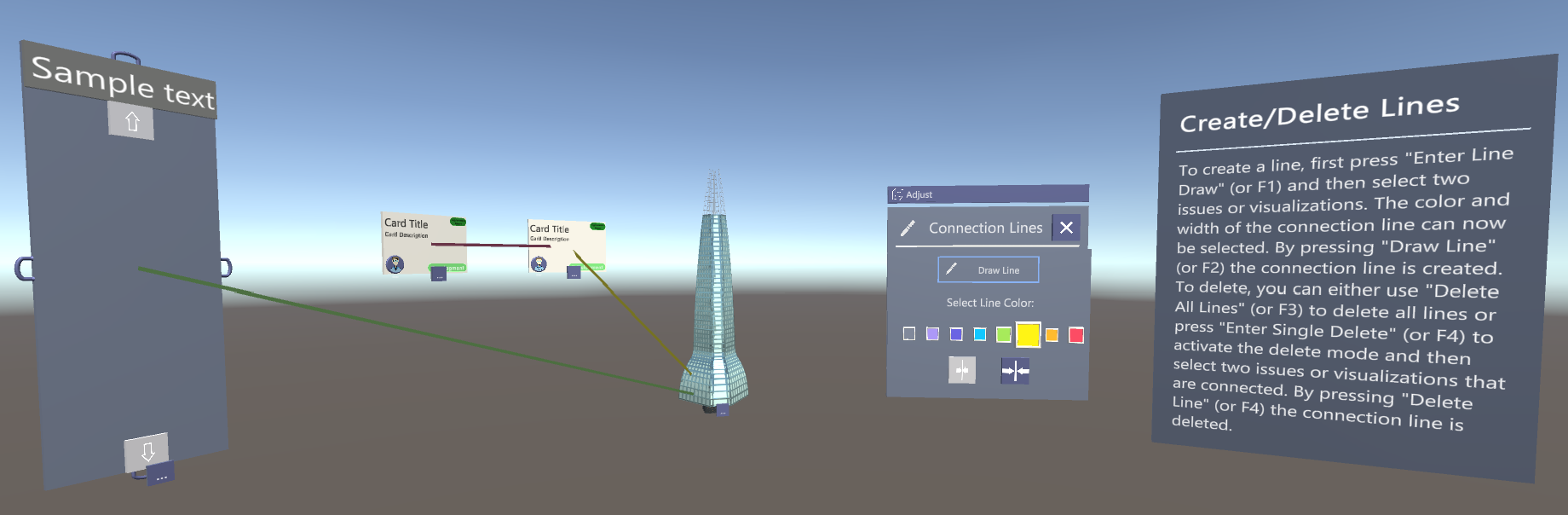 Testscene: The project provides a test scene in order to explore the feature in a confined environment. The scene can be found in the Tests>ConnectionLines folder. Several visualizations and issues can be selected to either create or delete lines between them. To do this, follow the above given instructions. Alternatively, you can use the key F1 to enter the drawing mode and exit it with F2. Furthermore, F3 deletes all lines and F4 enters and exits the single delete mode. Do not close the connection line menu.