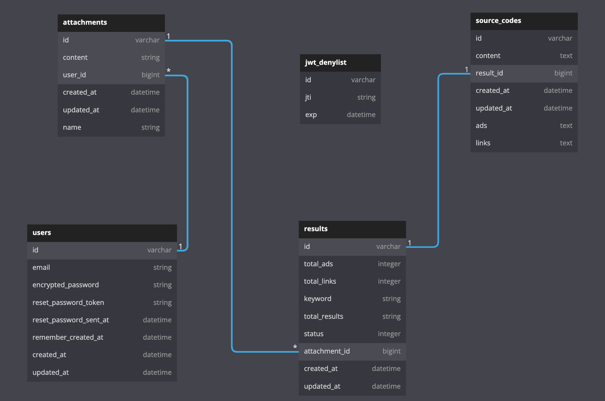 usersstore information of the userattachmentsstore the name and contents of the file after removing duplicate keywordresultsstore the necessary datas (like the numbers)source_codesstore source code of the Advertisement, Links, and HTML code of the Google search page. That needs to be separated because it contains large data.