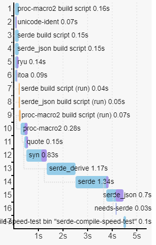 However, you can easily break this dependency chain, by not activating the derive and instead depending on serde_derive yourself. This allows serde and its dependents like serde_json and a made up needs-serde in my example to compile from the beginning of the compilation, completely in parallel to all the derive related crates.