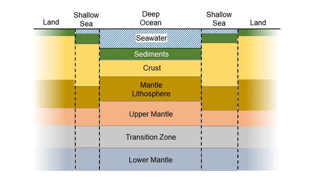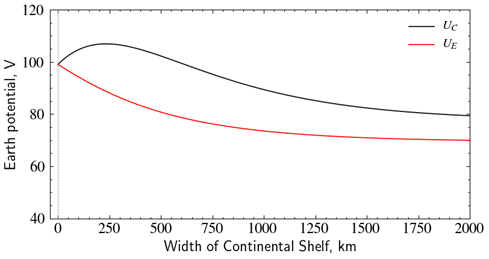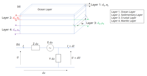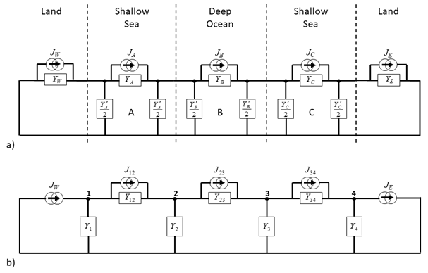 During geomagnetic disturbances, electric fields induced in the Earth and in power systems, pipelines and submarine cables can interfere with the operation of these systems. Calculations for submarine cables are complicated by the need to consider not just the induction directly into the cable but also the earth potentials produced at the coast at each end of the cable. To determine the coast potentials, we present a new model of the ocean and earth conductivity structure that spans the whole length of a cable from one coast to another. Calculations are based on the generalised thin sheet approach introduced by Ranganayaki and Madden (1980) but converted to a transmission line model that can be solved using standard circuit theory techniques. It is shown how the transmission line model can be used to calculate the earth potential profile from one side of an ocean or sea to the other. Example calculations are presented for a shallow sea, a shallow ocean, and a deep ocean that are simplified approximations to the North Sea, Tasman Sea and Pacific Ocean and show that the peak potentials occur at the coast. An examination is also made of how the width of a shallow sea and width of the continental shelf affects these coast potentials. The modelling technique and example results provide a guide for more detailed modelling of geomagnetic induction along the routes of specific submarine cables.