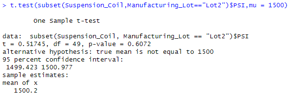 AskBCS was used on the "t.test(subset(Suspension_Coil,Manufacturing_Lot=="Lot1")$PSI,mu = 1500)" subset code.