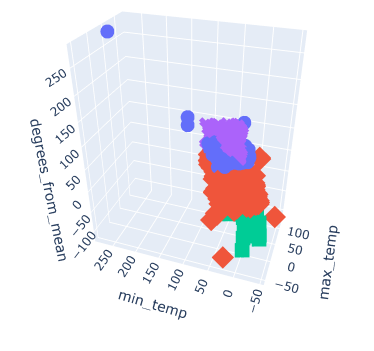 The provisional machine learning model will utilize an unsupervised model format using a clustering algorithm. The database created previously is to be connected to Jupyter Notebook using SQLAlchemy through an SQLite file, then converted into a DataFrame and explored from there. For the purpose of creating a provisional model, data was read in through a CSV file and a 3d plot was created to see the relationships between the "max_temp", "min_temp", "degrees_from_mean" columns to the initial 4 classifications of temperature anomalies.