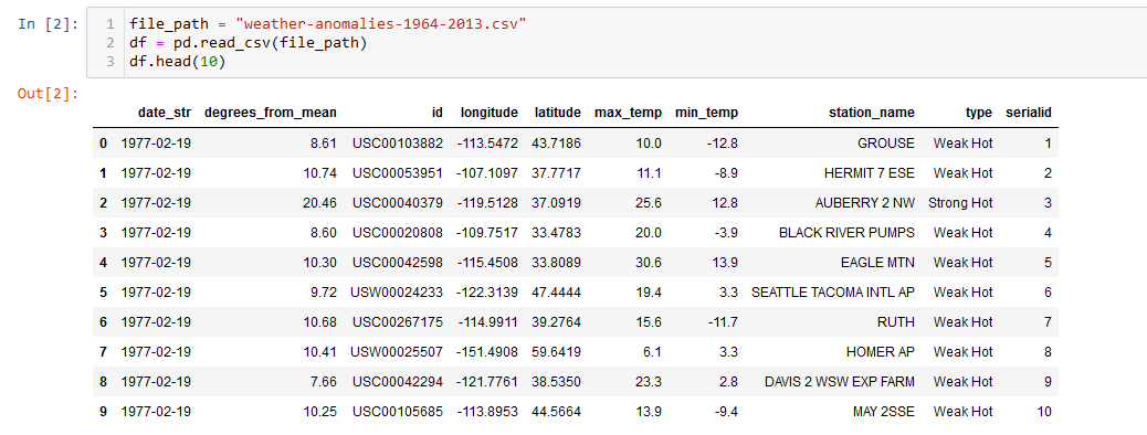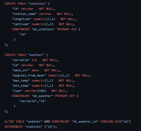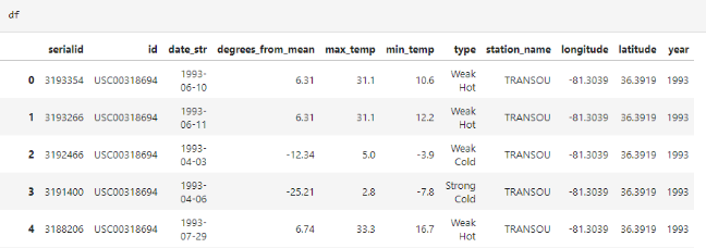 A provisional database was created using Postgres to hold two tables separating our data, "stations" and "weather". This will likely be the same database used to connect to the machine learning model to the data. The stations table holds each station's name, unique ID, as well as longitude and latitude. The weather table holds serial IDs (basically an index), the same station ID key, date, degrees of the anomaly away from the mean temperature, maximum temperature, minimum temperature, and the "type" of anomaly as described before.