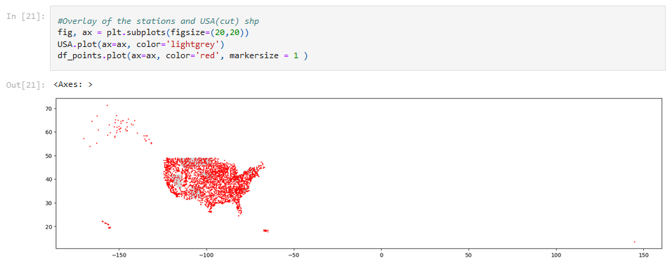 A shapefile for the U.S. was read and plotted for a closer look, as well as the stations being plotted.