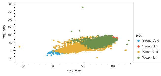 When reading the original data, the relevant columns for the weather anomalies lie in how "degrees_from_mean", "max_temp", and "min_temp" relate to the "type" column. The "type" column falls under four categories of description for the outlier: "Weak Hot", "Weak Cold", "Strong Hot", and "Strong Cold". How do these factors contribute to a weather anomaly being described as one of these types and can a machine learning model accurately group and predict a classification? There doesn't seem to be a definite filter or range on how the type is labeled, which is what we wish to explore.