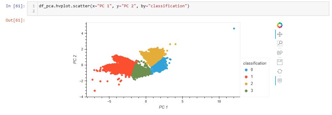 We already know from the original data that we want 4 clusters, so it's easy enough to specify that when using K-Means. The data was fit for use in the model, and then the predictions of the classifications were printed and inserted into the DataFrame with the principal components.