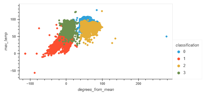 The relationship between "degrees_from_mean" and "max_temp" was plotted for the original typing, as well as the machine-generated classification.