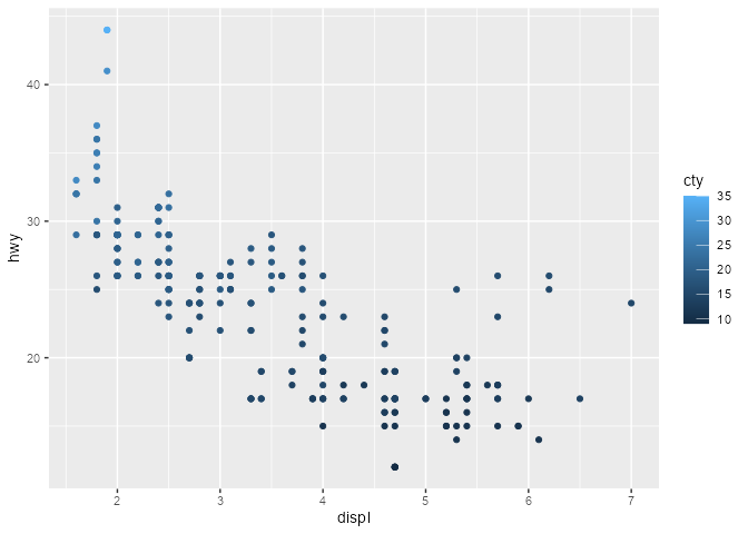 ggplot(mpg, aes(displ, hwy, colour = cty)) +