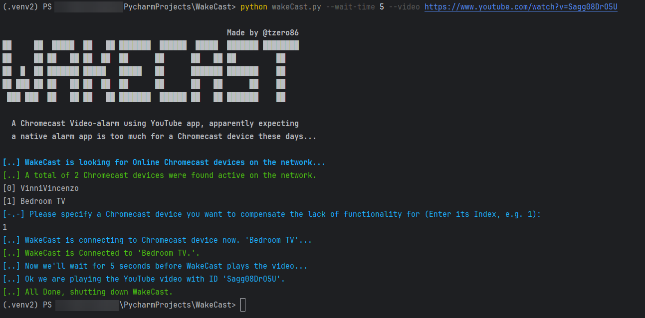 --wait-time: The time to wait before triggering the alarm.--video: (optional): The URL of the YouTube video to play. If not provided, the default video will be played (Regular Phone Alarm Sound).--device(optional): The name of the Chromecast device to play the alarm on. If not provided, WakeCast will search for available devices and prompt you to select one.