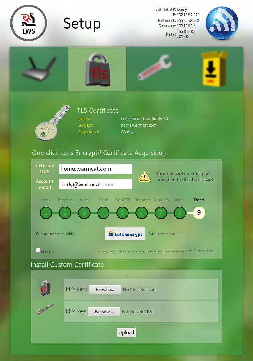Automated Let's Encrypt certificate acquisition (requires external :443 forwarded to the device :443)