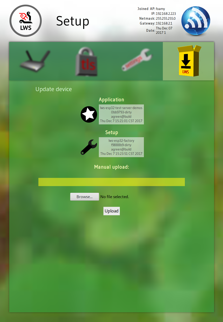 The build/*.bin file from the application build may also be uploaded in the setup page upload UI.