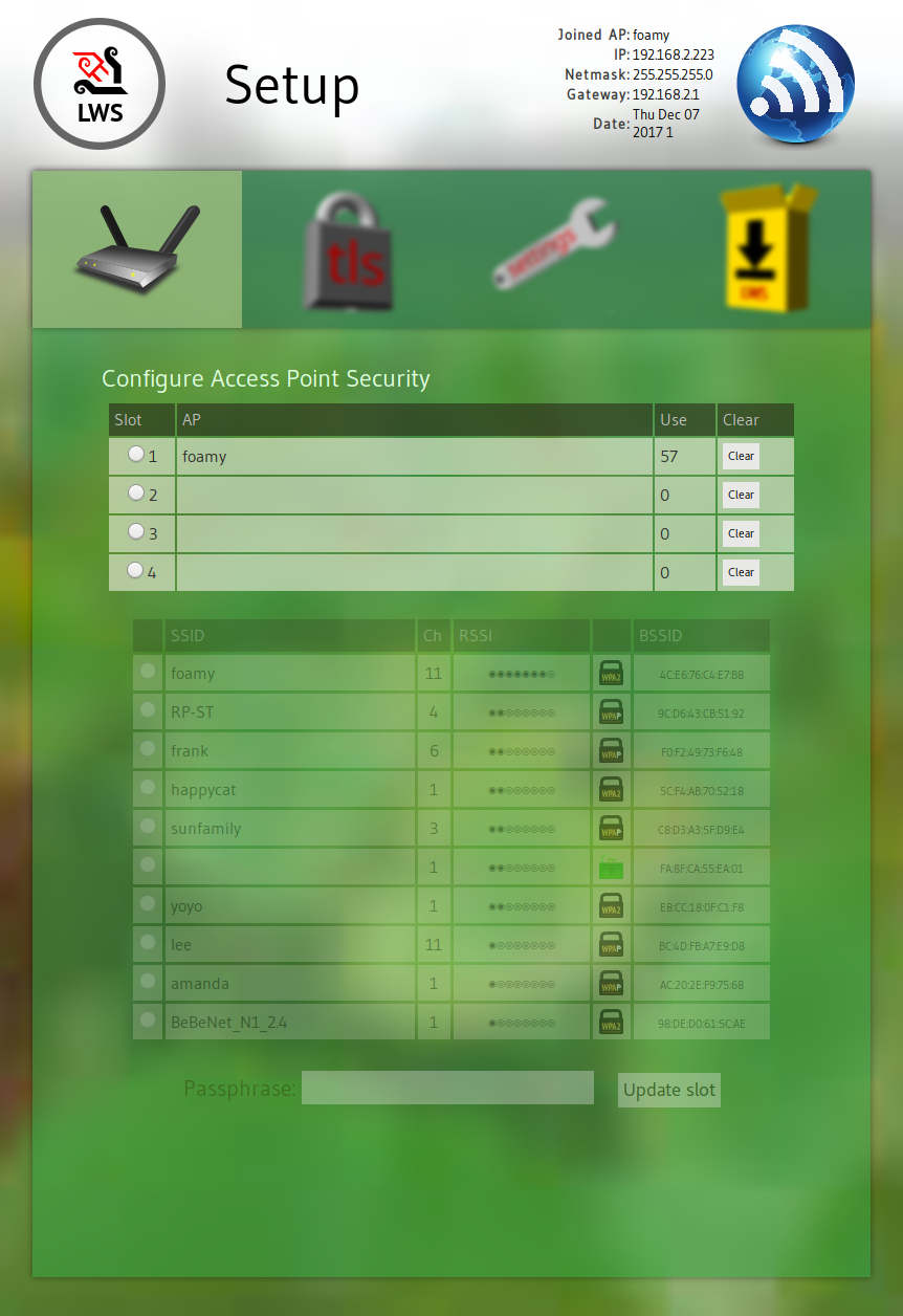 Selecting up to 4 APs the device can connect to along with necessary passphrases