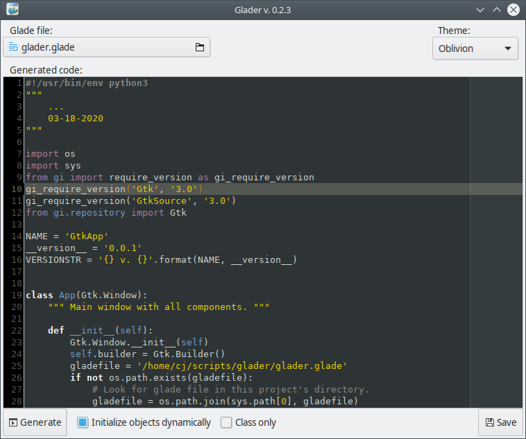 Generates skeleton code from a glade file. The generated signal handler stubs can then be filled in to provide functionality. Arguments for signal handlers are automatically decided through introspection using Gtk.