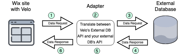 The Wix-Data SPI is a REST over HTTPS protocol in which the Wix site forwards database operations to the adaptor (1), which translates them to native DB operations (2). The adaptor calls the external database (3), gets the response (4), translates the response back to the wix-data protocol (5), and responds to the SPI request (6).