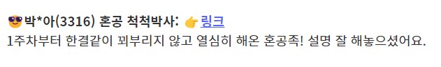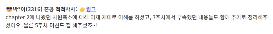 [한빛미디어] 혼공학습단 8기 2023년 05월 이전으로, 개명 전 이름 박윤아로 참여했습니다. 1주차(7/4 ~ 7/10) Chapter 01 ~ 02 / 나의 첫 머신러닝 , 데이터 다루기 https://blog.naver.com/pyi3316/222799106901 2주차(7/11 ~ 7/17) Chapter 03 / 회귀 알고리즘과 모델 규제 https://blog.naver.com/pyi3316/222813977979 3주차(7/18 ~ 7/24) Chapter 04 / 다양한 분류 알고리즘 https://blog.naver.com/pyi3316/222817748493 우수학습자 선정 4주차(7/25 ~ 7/31) Chapter 05 / 트리 알고리즘 https://blog.naver.com/pyi3316/222835497608 5주차(8/8 ~ 8/14) Chapter 06 /비지도 학습 https://blog.naver.com/pyi3316/222846617966 우수학습자 선정 6주차(8/15 ~ 8/21) Chapter 07 / 딥러닝을 시작합니다 https://blog.naver.com/pyi3316/222851282417 번외 Chapter 08 / 이미지를 위한 인공신경망 https://blog.naver.com/pyi3316/222860790669 Chapter 09 / 텍스트를 위한 인공신경망 https://blog.naver.com/pyi3316/222862637453